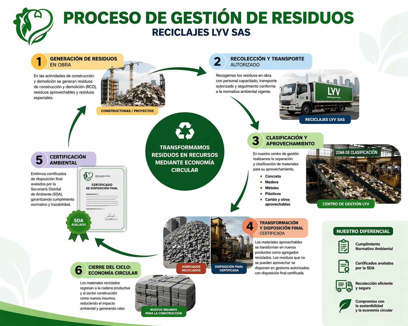 Gestión completa de residuos de construcción y demolición, desde la recolección hasta el aprovechamiento o disposición final certificada.
